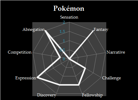 In honour of our new series, Playing with Aesthetics, and with a new Pokémon game approaching, I’d like to take this opportunity to dredge up the topic of Core Aesthetics again, and use it as a lens on the design of Pokémon games (and the upcoming Pokemon X/Y). I believe that a lot can be learned about the broad appeal of Pokémon games by examining how it covers many different core aesthetics. Through iteration and improvement over its history, the Pokémon games have kept many core game elements constant. Instead of constantly changing or over-developing, the game has steadily spread to reach many more aesthetics than the average game can.